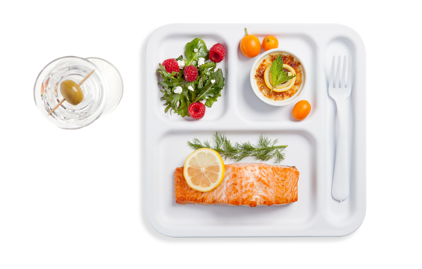 Filet of Alaska Salmon with lemon and dill, mixed green salad with gorgonzola and raspberries, kumquat creme brulee. Photograph by Jonathan Gayman, food styling by Carrie Province.