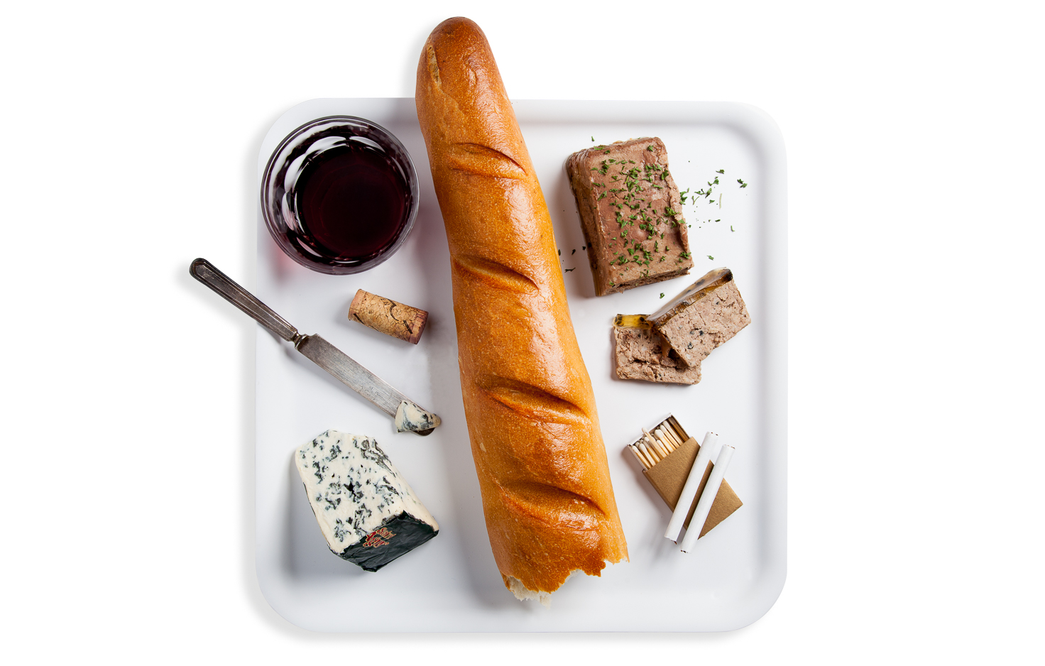Baguette, pate du foi gras, stinky cheese, red wine, and cigarettes. Photograph by Jonathan Gayman, food styling by Carrie Province.